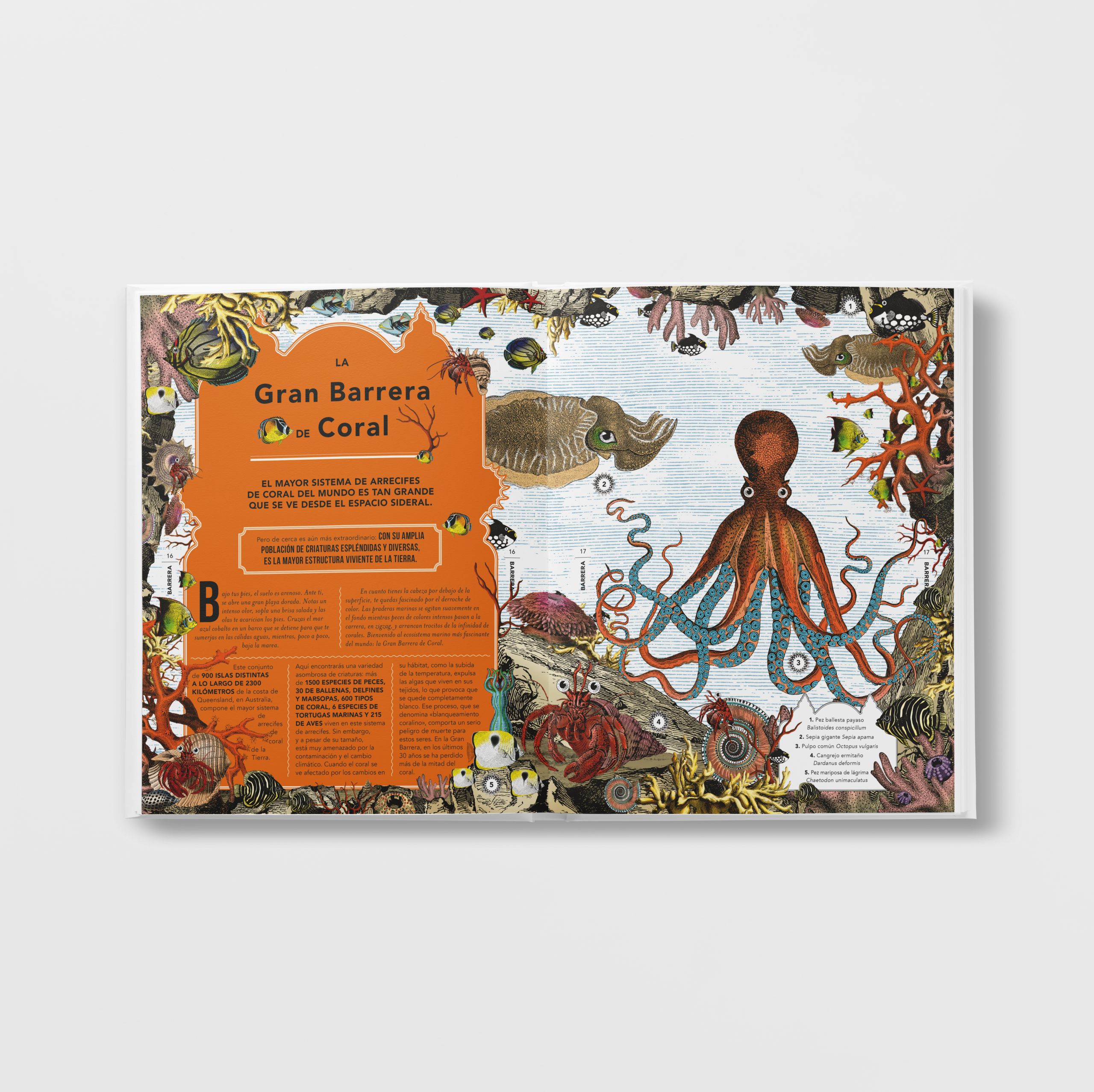 Prepara’t i passa la pàgina per endinsar-te en la selva tropical de l’Amazònia, càlida i humida, i després capbussar-te al mar per descobrir els bancs de peixos que neden per la GRAN BARRERA DE CORALL. Des d’allà viatjaràs a un dels llocs més secs de la Terra, el DESERT DE CHIHUAHUA, on l’horitzó s’estén més lluny que mai, i després sentiràs que la natura t’envolta pels quatre costats en passejar-te pels paratges de conte de fades de la SELVA NEGRA. Per últim, et traslladaràs fins al sostre del món, el MASSÍS DE L’HIMÀLAIA, des d’on podràs veure com es desplega als teus peus el jardí de les meravelles del nostre planeta en la seva màxima esplendor.